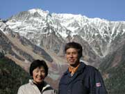 昼下がりの強い陽光を浴びた穂高岳沢をバックに御両親